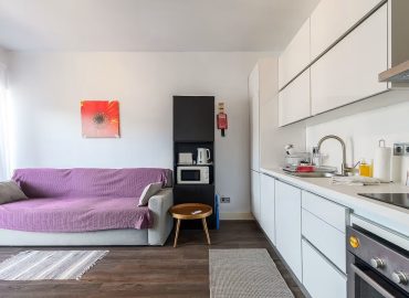 Apartamento está bem equipado, com quarto de cama de casal, um wc renovado, sala com kitchenette e uma varanda.